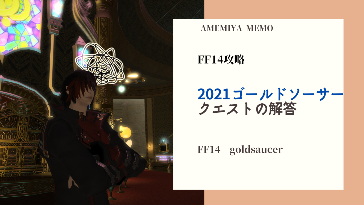 ff14, ゴールドソーサー・フェスティバル, シーズナルイベント, 攻略 FF14何の成果も得られなかった極ツクヨミ討滅戦 FF14リテイナーベンチャーほりだしもの依頼金策簿(18年6月3日~6月9日) ゴールドソーサーフェスティバル開催中は 特設景品交換窓口 というNPCが出現します。 なんと普通の景品交換窓口で買う時の 半額 で買えるなんともお得なサービス! バニービスチェなどの景品はこちらでお買い求めください! ※マウントなどの特定商品はこちらでは購入できませんのでご注意ください。 締め書き〆 小隊任務Lv40以上に出動させられる方は、 ゴールド この記事では ゴールドソーサーフェスティバル21のクエストの答え をお伝えしていきます。 めっちゃネタバレなのでご注意ください。 証言集め このクエストは ウルダハのナル回廊にいるオリアー(X94Y92) からクエストを受注することからスタート